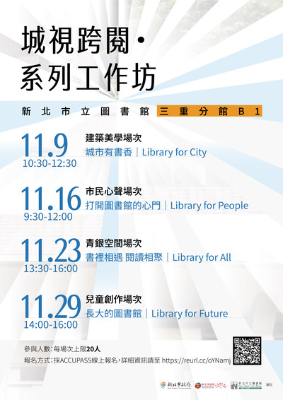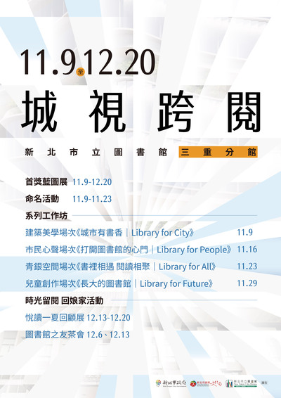 以「城視跨閱」為主題, 自11月9日至12月20日 於三重分館正式登場。活動公開第二總館競圖首獎藍圖與建築模型,並啟動命名活動與四場城市工作坊,邀請市民共想未來圖書館的樣貌;同時以時光留閱・回娘家回顧展重溫舊館記憶,串聯城市閱讀的過去與未來。